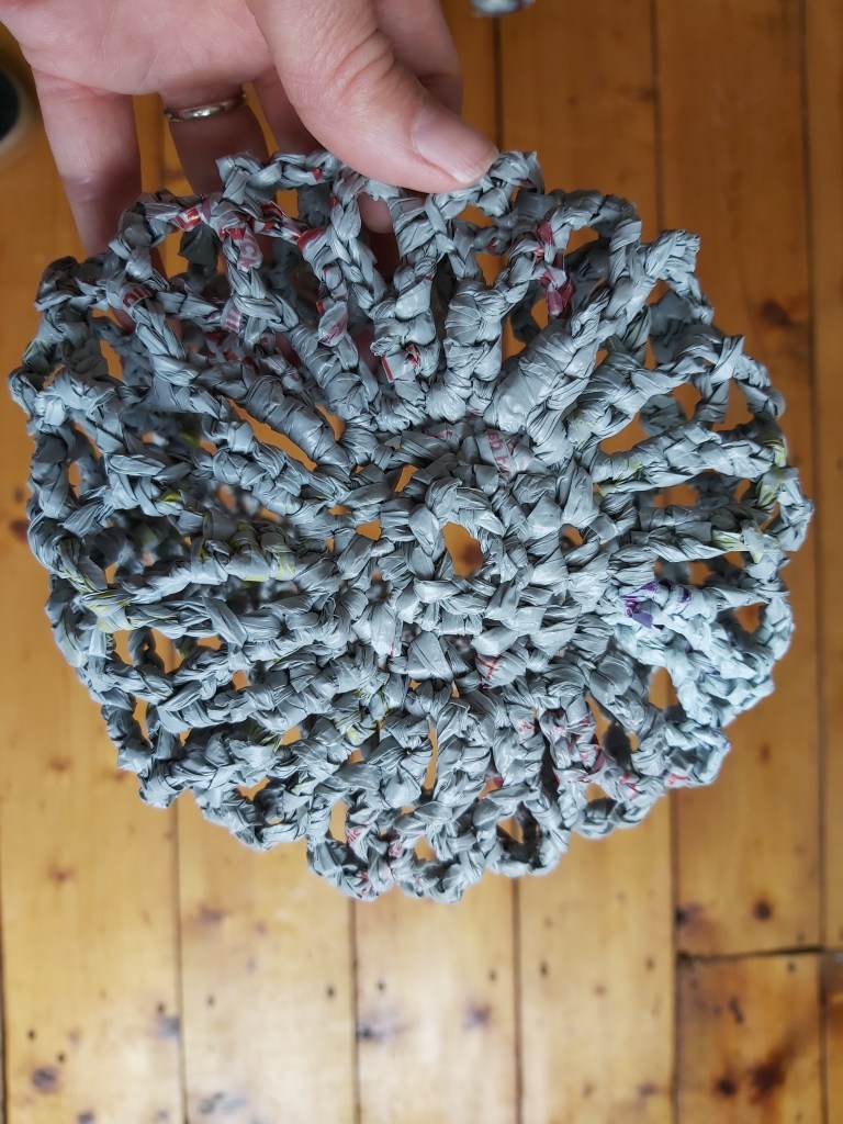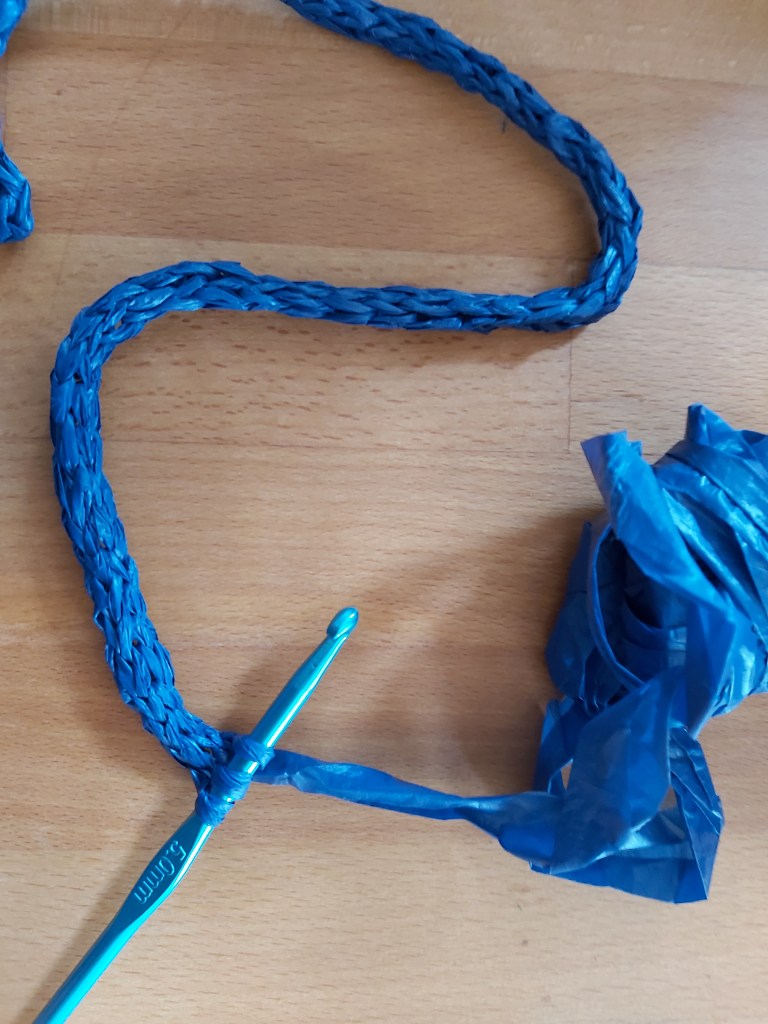 The pattern uses UK terminology; US alternatives are indicated. I have experimented with different yarns and hook sizes. The yarn and hook used for this version can easily be substituted for whatever you have at hand. Instructions for how to make plarn are given at the end of the pattern in a picture tutorial.