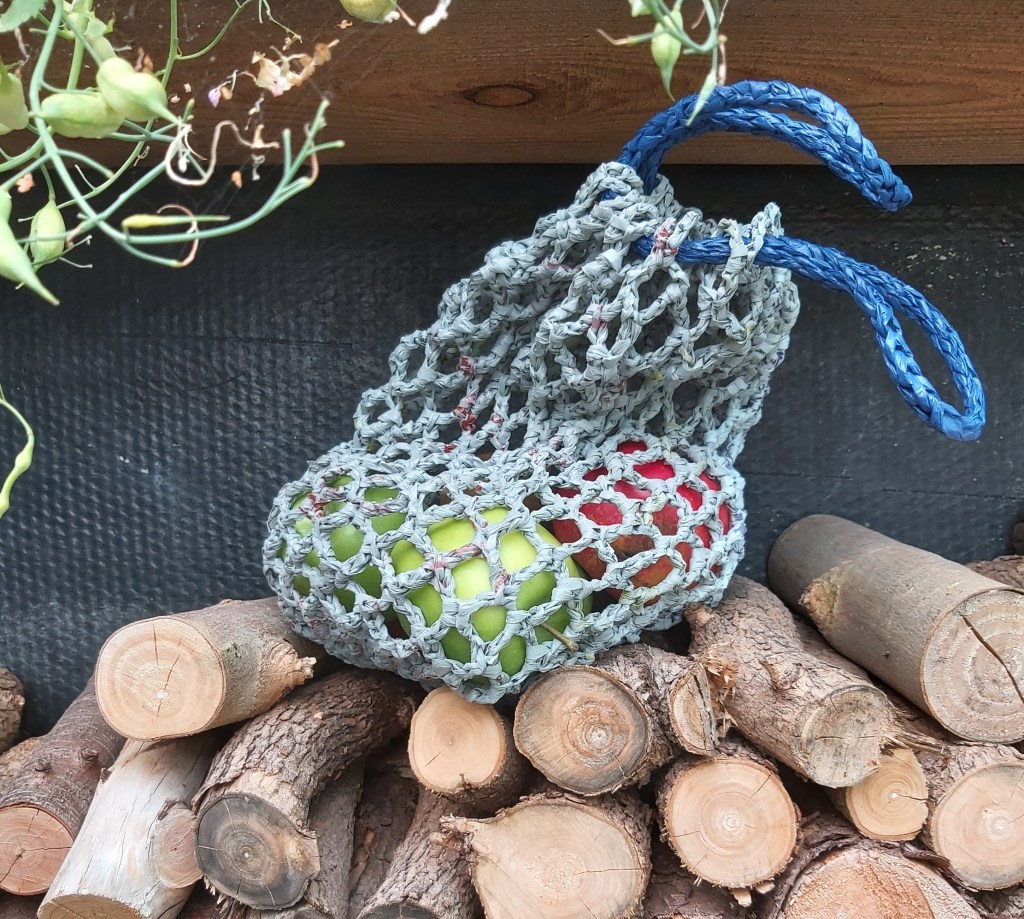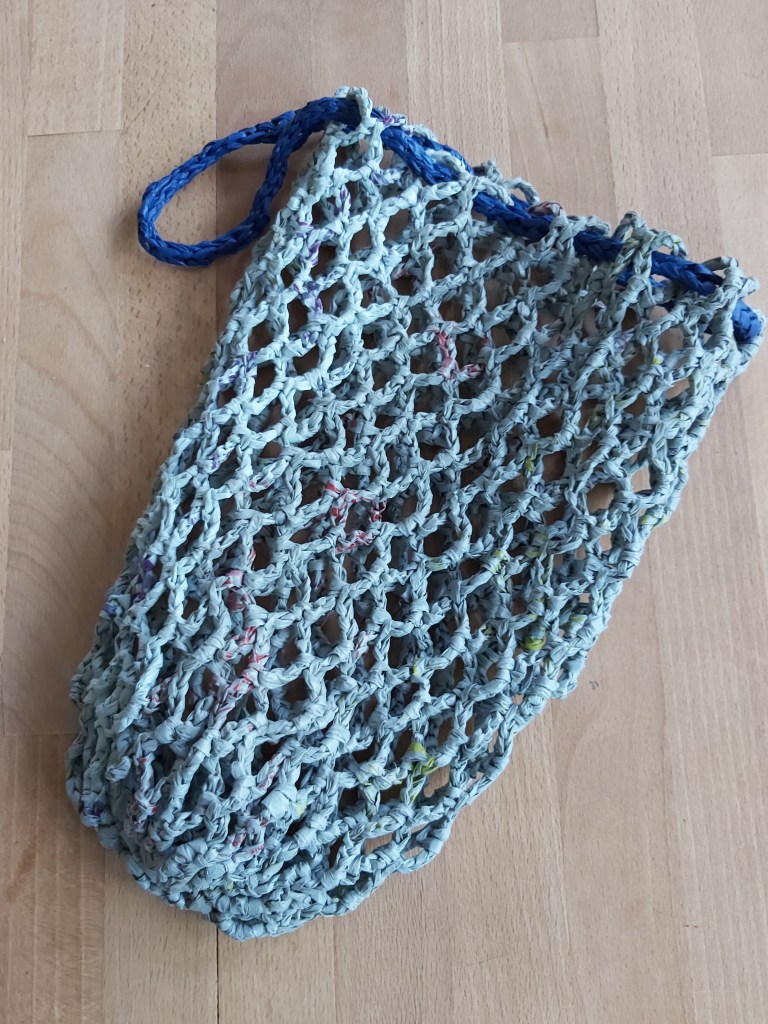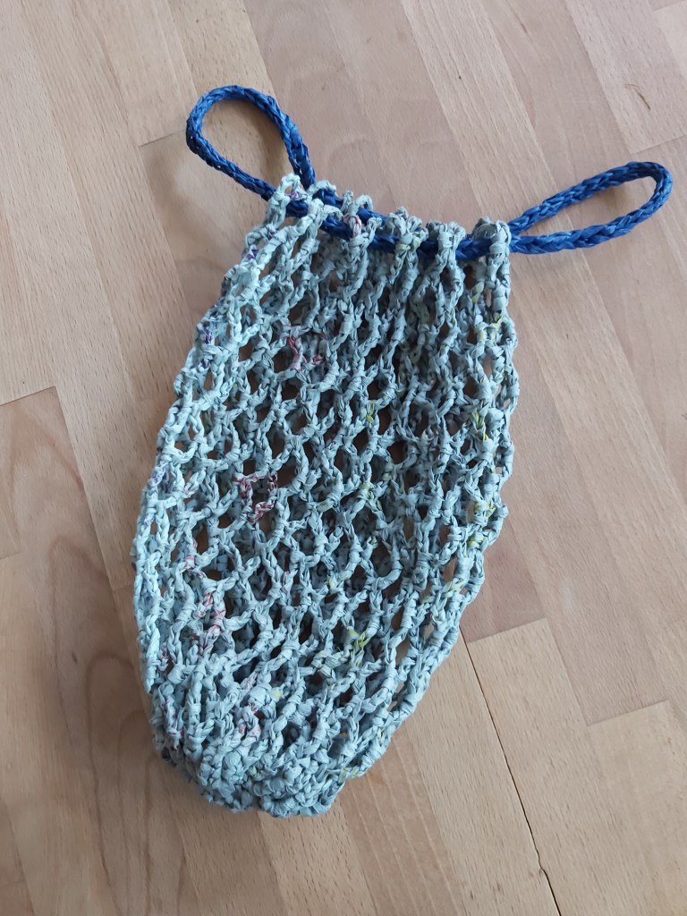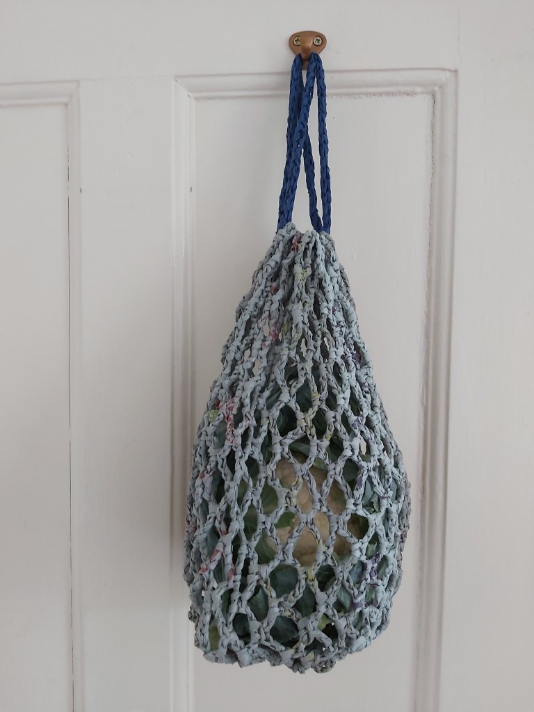 This project was originally conceived to repurpose the non-returnable bags we accumulated from online grocery shopping during the recent Covid 19 lockdown. As well as looking good, it’s very sturdy and can be washed quickly and easily; so no worries about putting it in the fridge! It has a handy draw string cord to stop your fruit and veg escaping. This was worked as an i-cord which is a really handy technique to master. PlanetJune does a very nice i-cord tutorial if you are curious. I chose to use a rich blue plarn to provide a contrast to the muted gray shades of the bag. The grey bags are from Ocado.
