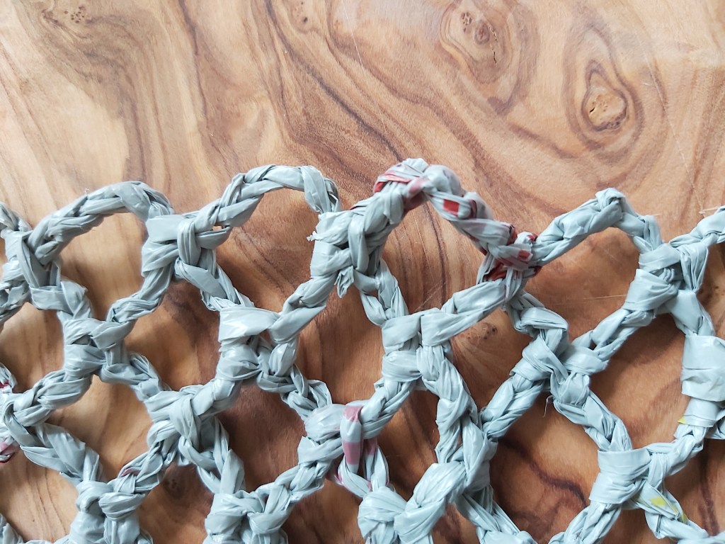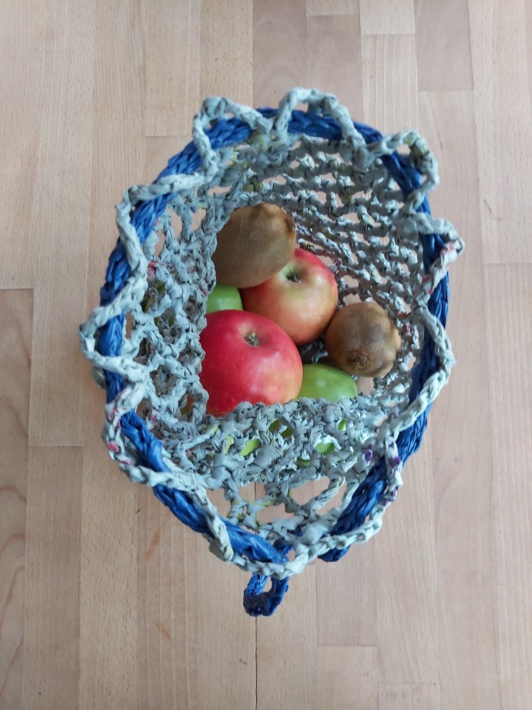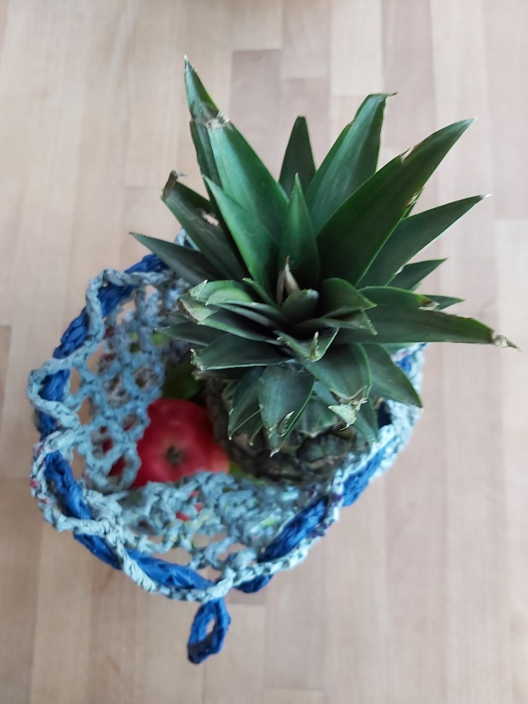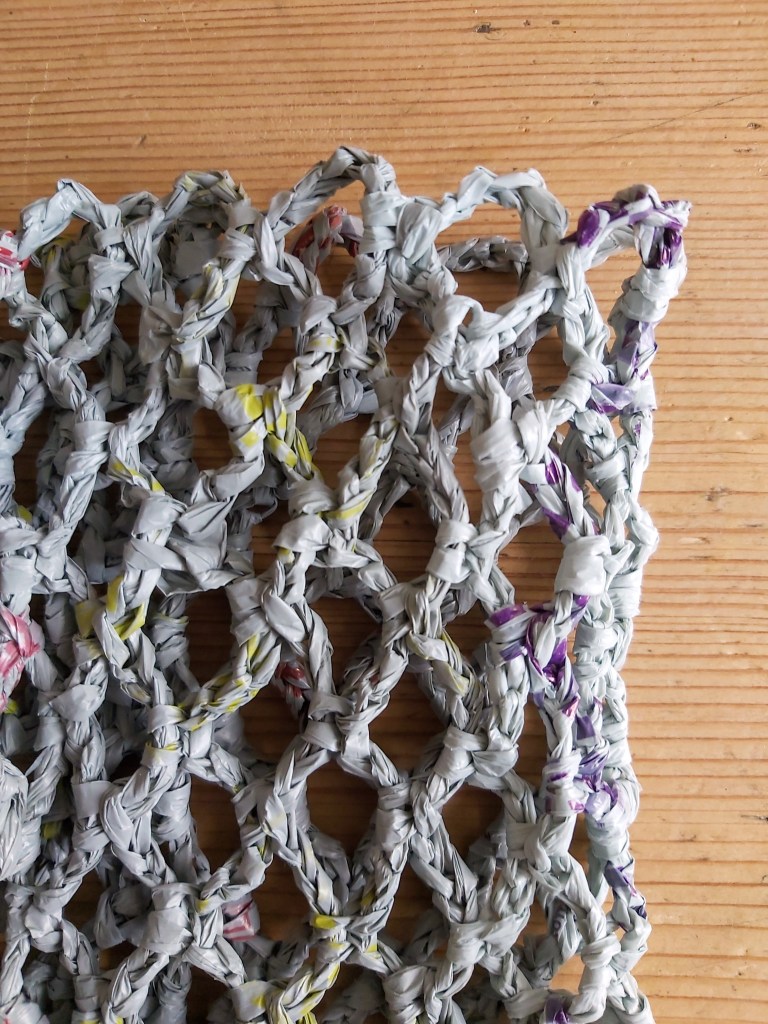 This project was originally conceived to repurpose the non-returnable bags we accumulated from online grocery shopping during the recent Covid 19 lockdown. As well as looking good, it’s very sturdy and can be washed quickly and easily; so no worries about putting it in the fridge! It has a handy draw string cord to stop your fruit and veg escaping. This was worked as an i-cord which is a really handy technique to master. PlanetJune does a very nice i-cord tutorial if you are curious. I chose to use a rich blue plarn to provide a contrast to the muted gray shades of the bag. The grey bags are from Ocado.