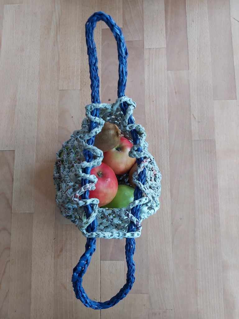 This practical produce bag is made of recycled plastic grocery bags (otherwise known as plarn). If you want to know how to make plarn take a look at this blog and video tutorial.