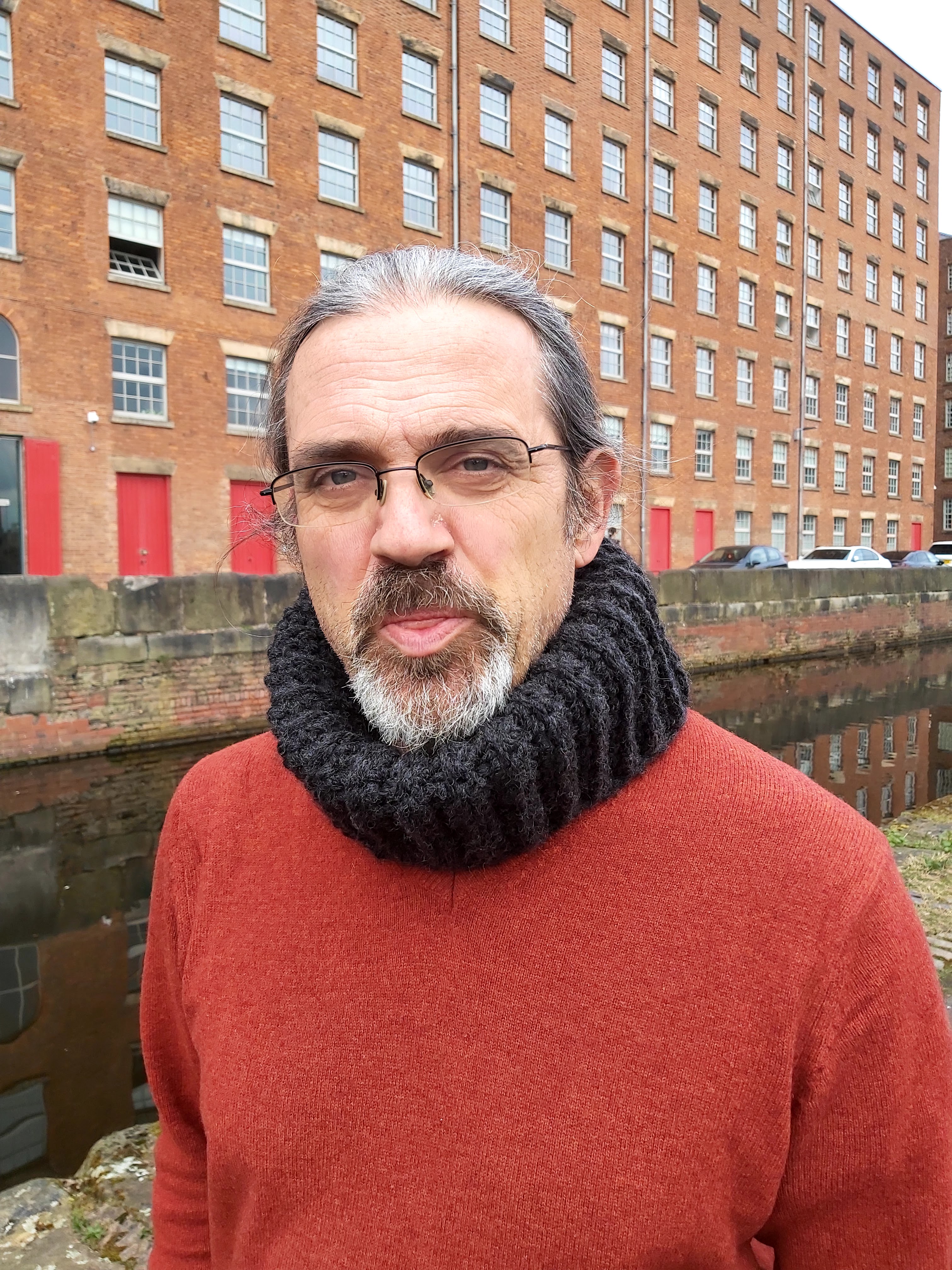 We were out and about today in Manchester getting some exercise and trying to find interesting local places to go. We’ve just about had enough of our usual parks and walks, as they’ve become all too familiar during the latest lock down! We ventured up to New Islington which is where I took this shot of Bill wearing a big chunky crochet cowl. I’m part way through writing up the pattern. It’s a quick, simple project and I love the clean, unfussy silhouette. Here’s another cheeky shot.