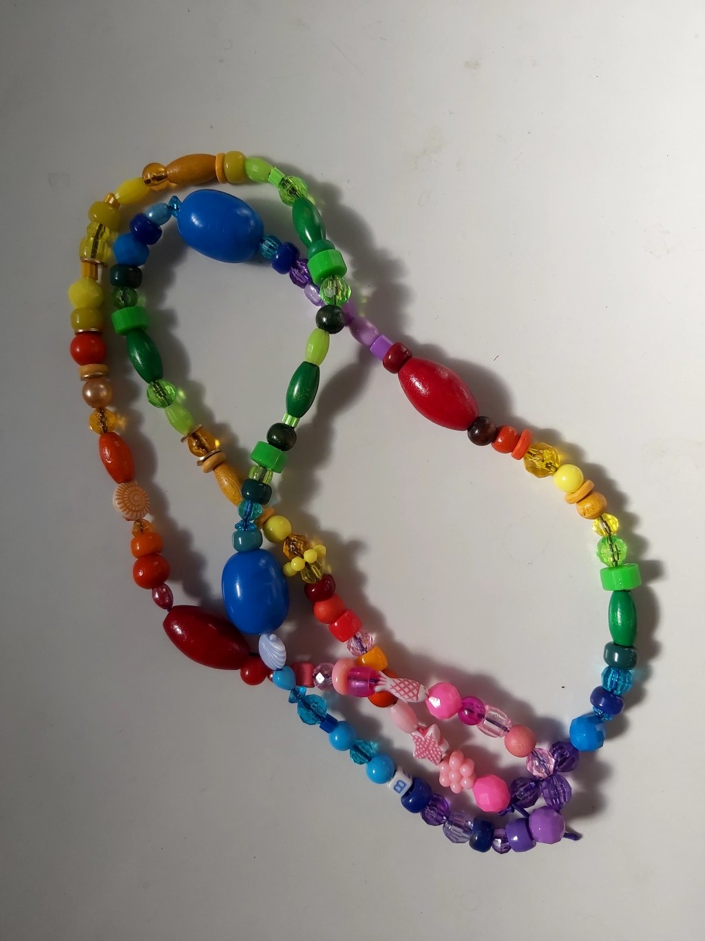 Recently I needed some little prizes to put in the layers of a pass-the-parcel and some bigger prizes for other games. So in an attempt to be thrifty and reuse stuff I already have, out came the bead box and some hat elastic. Further inspiration came from my three years old’s current interest in sorting things by colour. The result was eight little rainbow bracelets (which I forgot to photograph) and two necklaces.